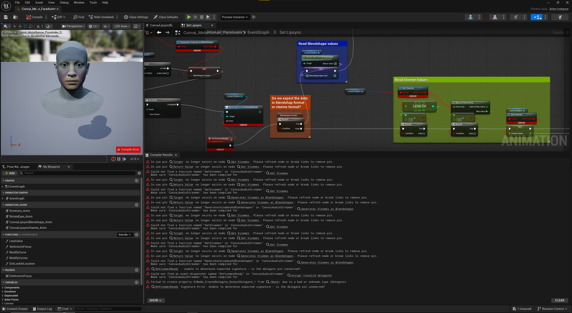 Hi, when trying to setup a custom metahuman in UE 5.7 the error “Blueprint failed to compile: Convai_Metahuman_FaceAnim” show up, when I press play the lipsync doesn’t work, everything else works well here is an screenshot of the errors in the blueprint, can anybody help? Thank you! ![]()